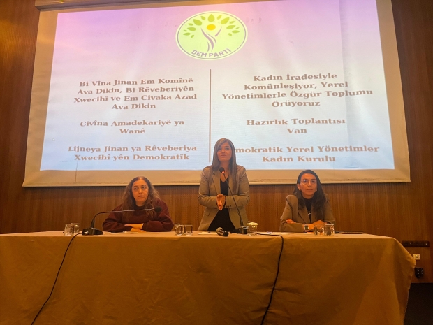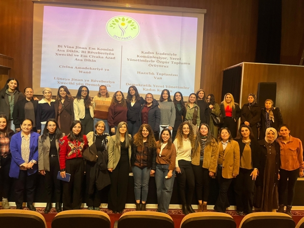 Van’da Demokratik Yerel Yönetimler Kadın Kurulu “Kadın iradesiyle komünleşiyor, yerel yönetimlerle özgür toplumu örüyoruz” şiarıyla toplantı düzenledi. İpekyolu Belediyesi’ne bağlı Berivan Kültür Merkezi’nde düzenlenen toplantıya Van Büyükşehir Belediyesi Eşbaşkanı Neslihan Şedal ile Demokratik Yerel Yönetimler Kadın Kurulu üyeleri katılırken, bölge belediyelerinin kadın politikaları müdürlüklerinde görevli çalışanlar da hazır bulundu.